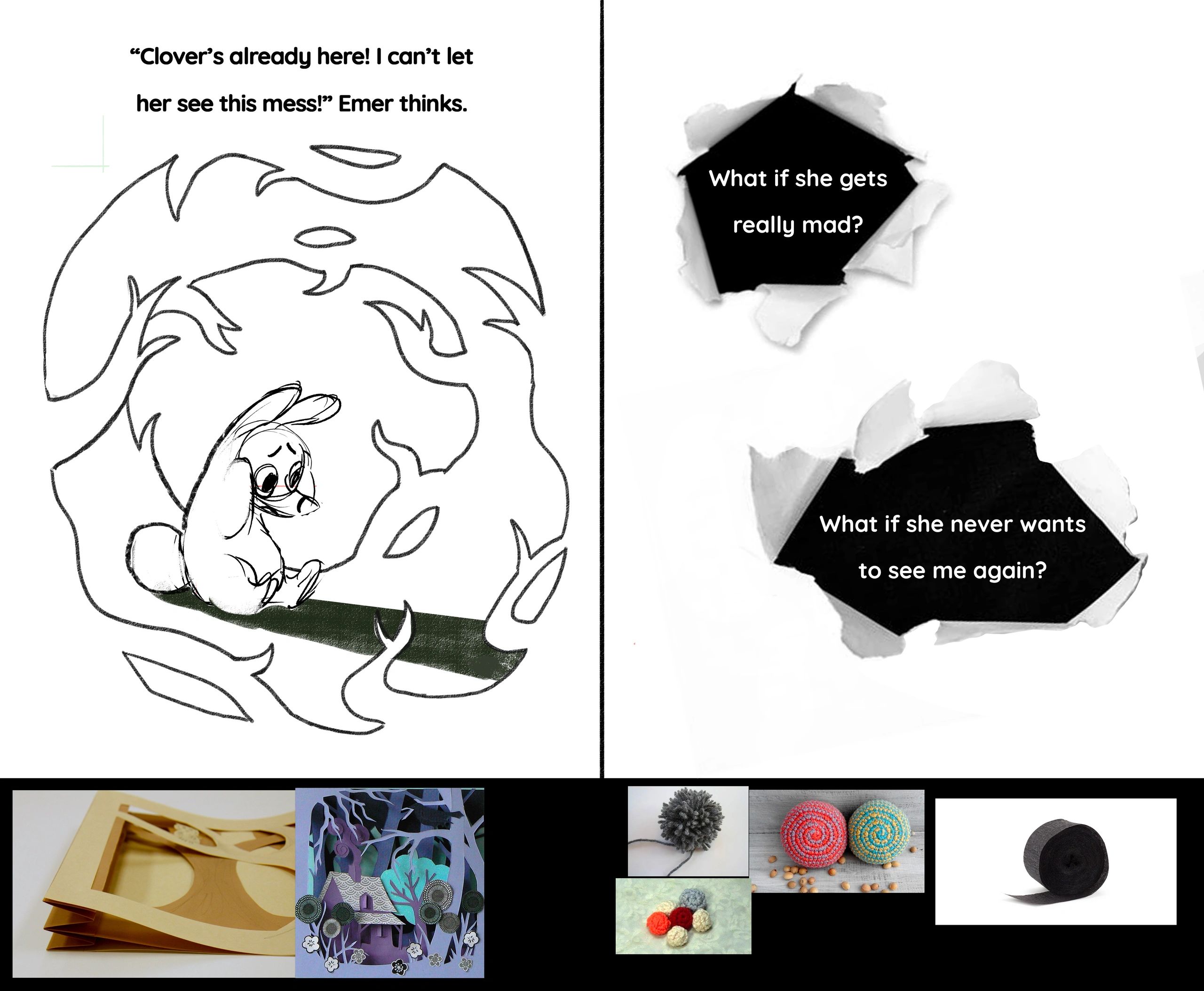 Final Image for Children's Book "Emer and Clover" BFA thesis project 2024. This miniature set was a team collaboration with Clare Korten, Carolan Korten, Angelina Nguyen, Sara Lau, and Hannah Gregoric.